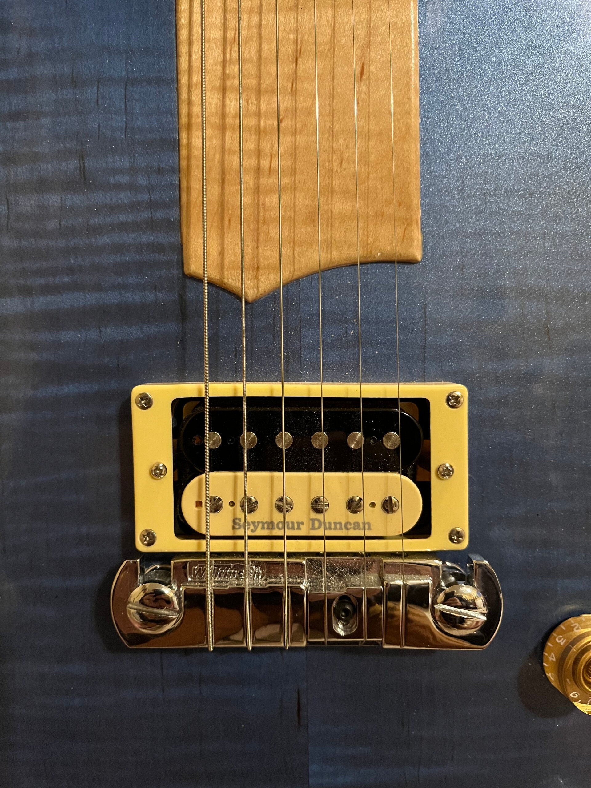 MOK1FB, Honduran mahogany body, flame maple top with reveal binding, 3 piece flame maple neck with flame maple binding and rosewood fretboard 59 neck carve, nitro lacquer finish, Seymour Duncan JB pickup with out of phase push pull tome pot, chrome hardware and gig bag case available for extra cost